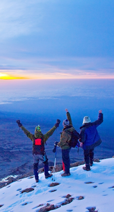 Heroppe er det næsten vinter, og det bliver koldere, jo højere op I kommer. Det er ikke ualmindeligt med temperaturer omkring -15 grader. I begynder vandringen op ad bjerget omkring midnat. Ved Stella Point, 5.725 meter over havet, kan I opleve symptomer på højdesyge, såsom kvalme og hovedpine. I kan føle, at I ikke har kræfter til at fortsætte vandringen, men det behøver ikke at stoppe jer fra at nå toppen af Mount Kilimanjaro, Uhuru Peak, som ligger 5.895 meter over havet. Uhuru Peak er Afrikas højeste punkt og verdens højeste fritstående bjerg. At stå på toppen kan være alle anstrengelserne værd. Glemt er opstigningens kvaler. Det er en utrolig følelse at stå på toppen – en præstation og et minde for livet. Oplev solopgangen på vej ned mod Mweka Camp, som ligger omtrent 3.000 meter over havet. I passerer Barafu Camp, hvor der bliver serveret mad, og I får mulighed for at hvile, før I fortsætter nedstigningen fra bjerget.
