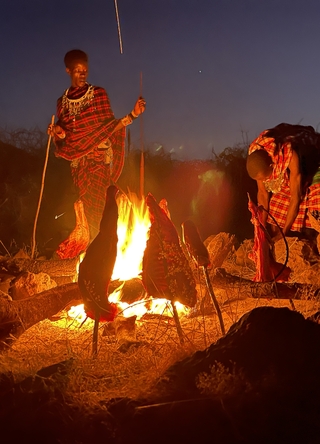 Sammen med jeres dygtige guide leder I efter elefanter, giraffer, zebraer, antiloper, løver, geparder, hyæner, strudse, bøfler og andre vilde dyr. I ankommer til campen ved solnedgang, fyldt med indtryk fra dagens safari. Nu kan I nyde en dejlig aften ved bålet under den afrikanske stjernehimmel.