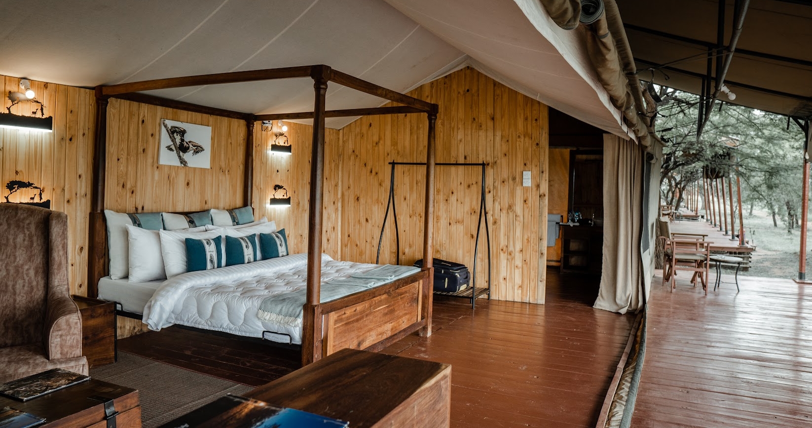 De store, rummelige og elegante telte er bygget på træplatforme. Ud over komfortable senge og badeværelser er der også udendørs bruser. Alle telte har en stor og rummelig veranda, hvor du kan se ud over Serengetis uendelige sletter.