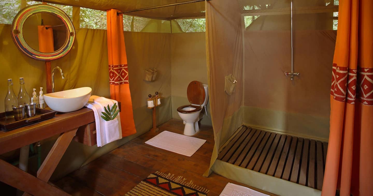 Hvert telt er stilfuldt og komfortabelt indrettet for at sikre en naturnær oplevelse. Den private veranda har en udendørs bruser, så du kan nyde den smukke omgivelse selv mens du bader.