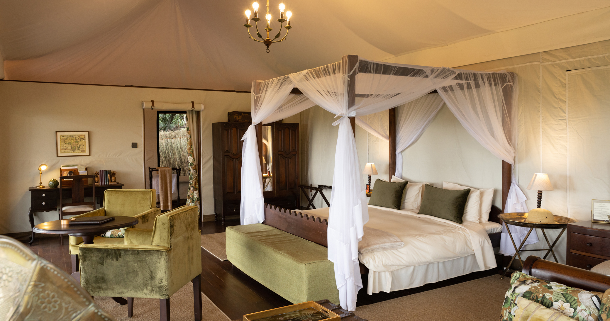 Den autentiske indretning afspejler safarieventyrene fra 1920'erne og suppleres med moderne komfort, inklusive et infinity-pool med udsigt over floden. Med kun 16 telte, inklusive et større familietelt, tilbyder lejren en eksklusiv og privat oplevelse og byder gæster i alle aldre velkommen.