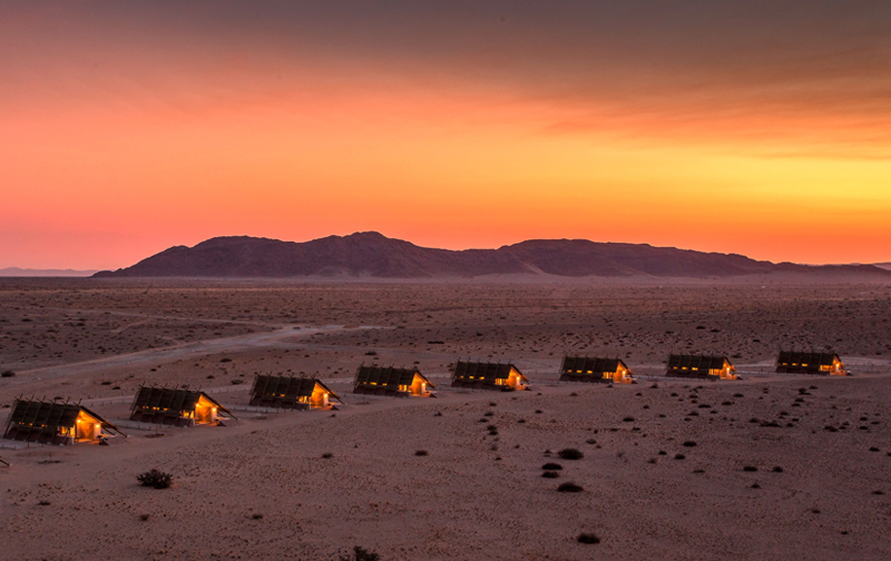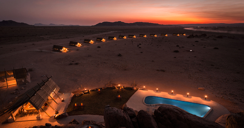 Desert Hills Lodge ligger på en lille høj i den sydvestlige ørken, nær UNESCOs verdensarvsområde Sossusvlei. Lodgen byder på enestående udsigt over områdets bjerge og ørkenlandskab og er kendt for sin unikke arkitektur, inspireret af de oprindelige nomadiske folk.