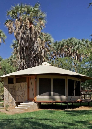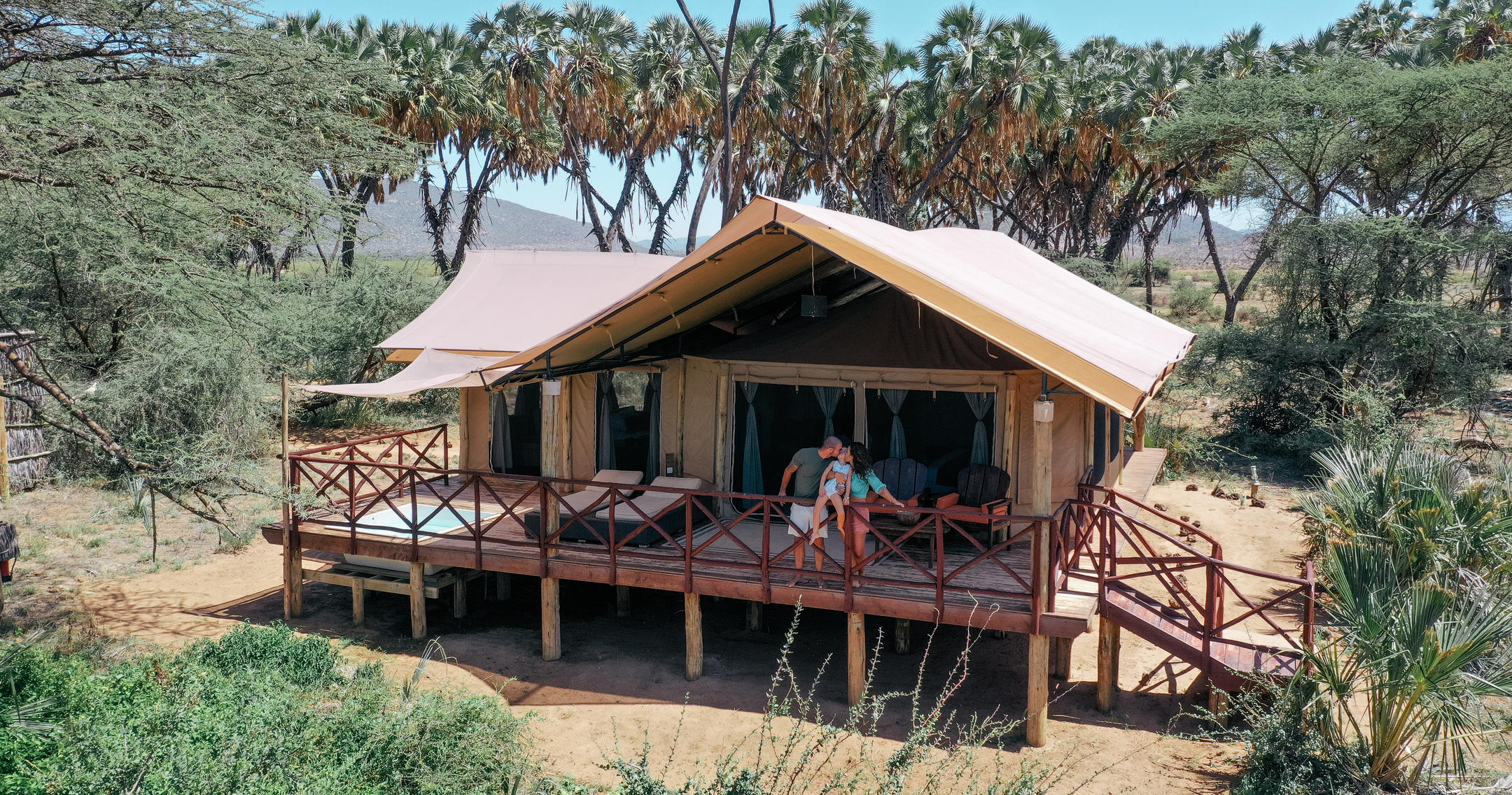 Teltene er moderne og har både toilet og bruser. Fra terrassen kan du køle dig ned med den milde flodbrise og nyde den smukke natur i Samburu.