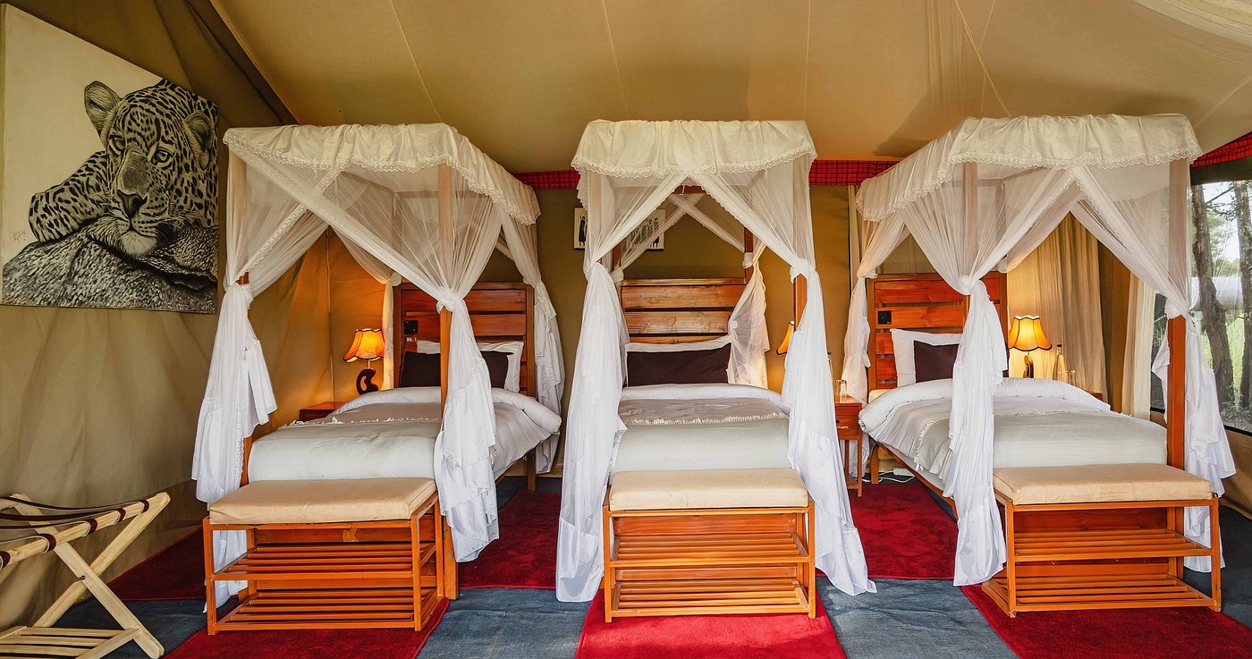 De store, rummelige og elegante telte er bygget på træplatforme. Ud over komfortable senge og badeværelser er der også udendørs bruser. Alle telte har en stor og rummelig veranda, hvor du kan se ud over Serengetis uendelige sletter.