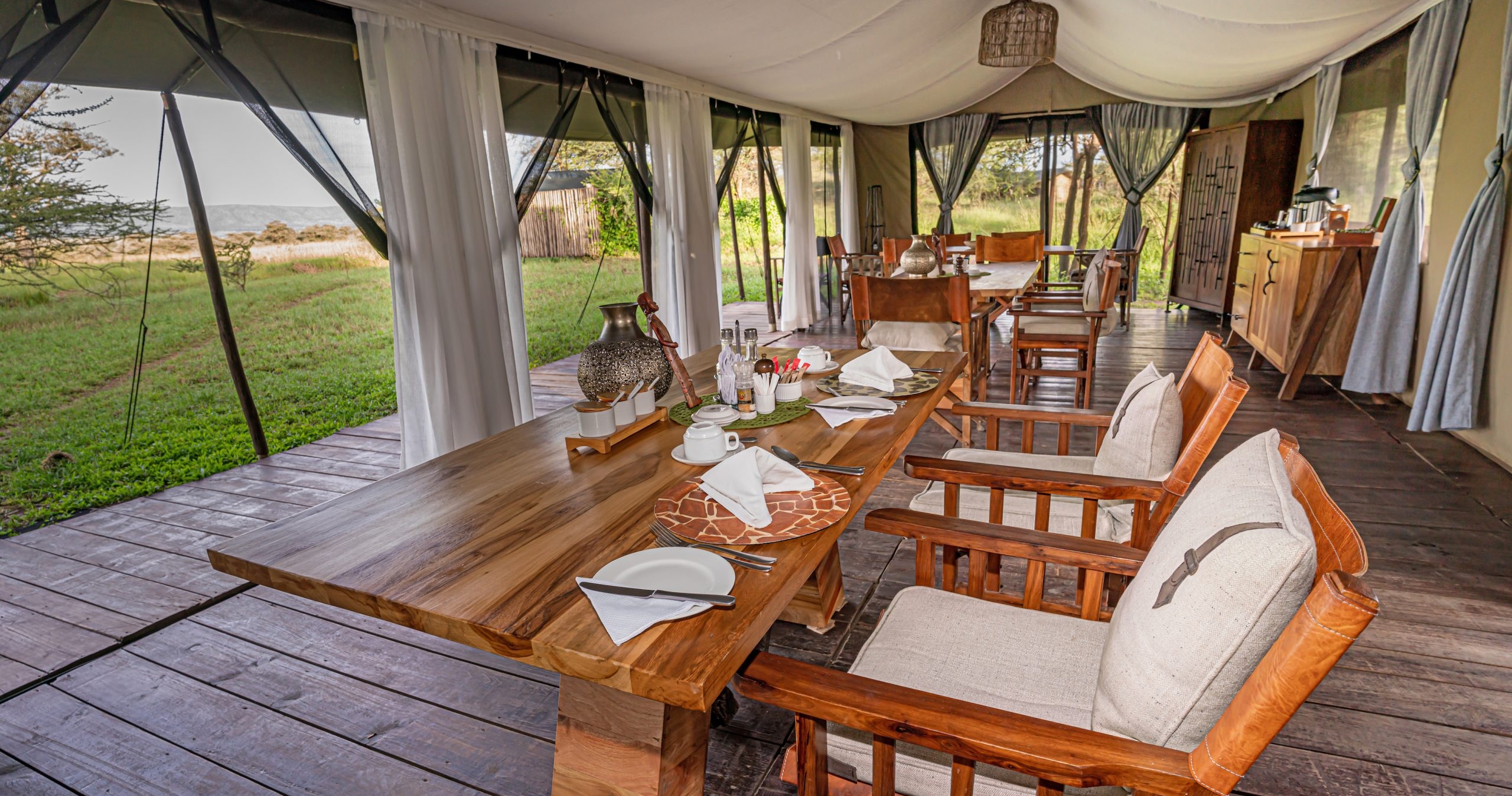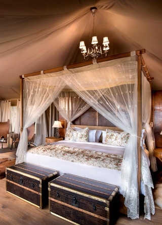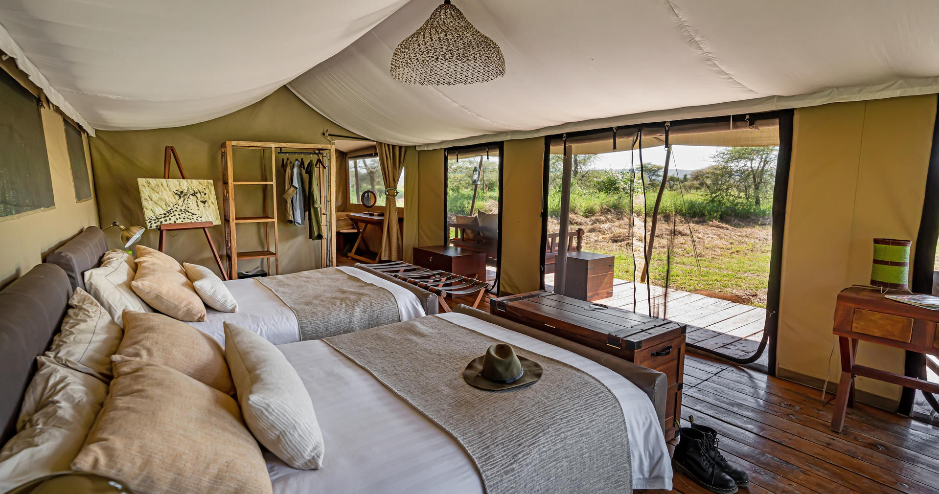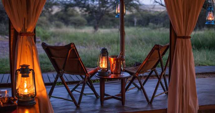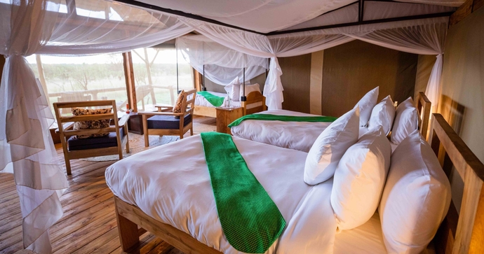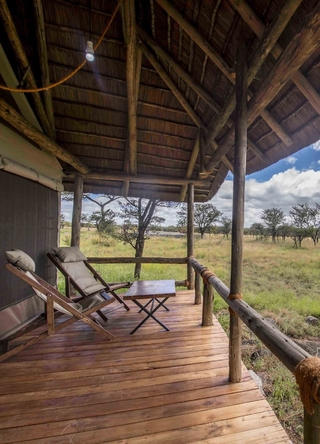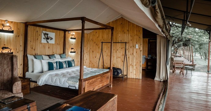 De store, rummelige og elegante telte er bygget på træplatforme. Ud over komfortable senge og badeværelser er der også udendørs bruser. Alle telte har en stor og rummelig veranda, hvor du kan se ud over Serengetis uendelige sletter.