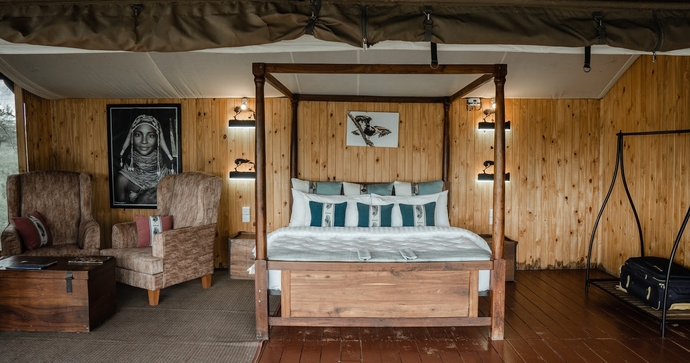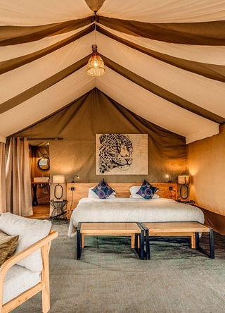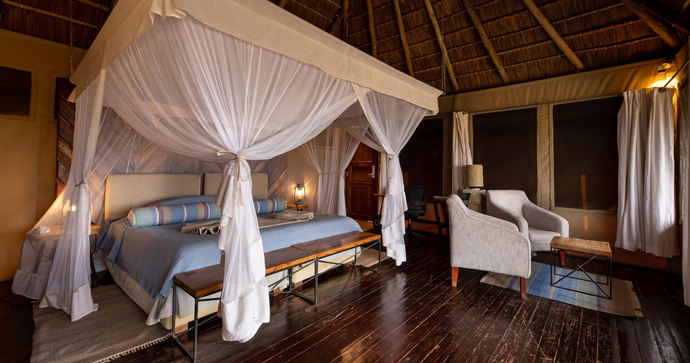 Her findes kun 12 luksuriøse telte, der tilbyder privatliv, komfort og panoramaudsigt. Hvert telt er rummeligt og elegant indrettet med moderne bekvemmeligheder og traditionelt afrikansk design, inklusive eget badeværelse, privat veranda og opholdsområder.
