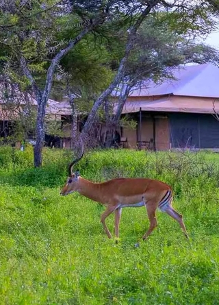 Campen består af smagfuldt indrettede telte, som skaber en herlig safariatmosfære. De rummelige telte har komfortable senge, toilet, brusebad og en stor veranda med udsigt over savannen.