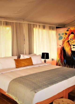 Campen tilbyder farverigt indrettede telte, alle udstyret med komfortable senge, eget badeværelse og WiFi. På din private veranda kan du læne dig tilbage og nyde den fantastiske udsigt over Serengetis landskab.
