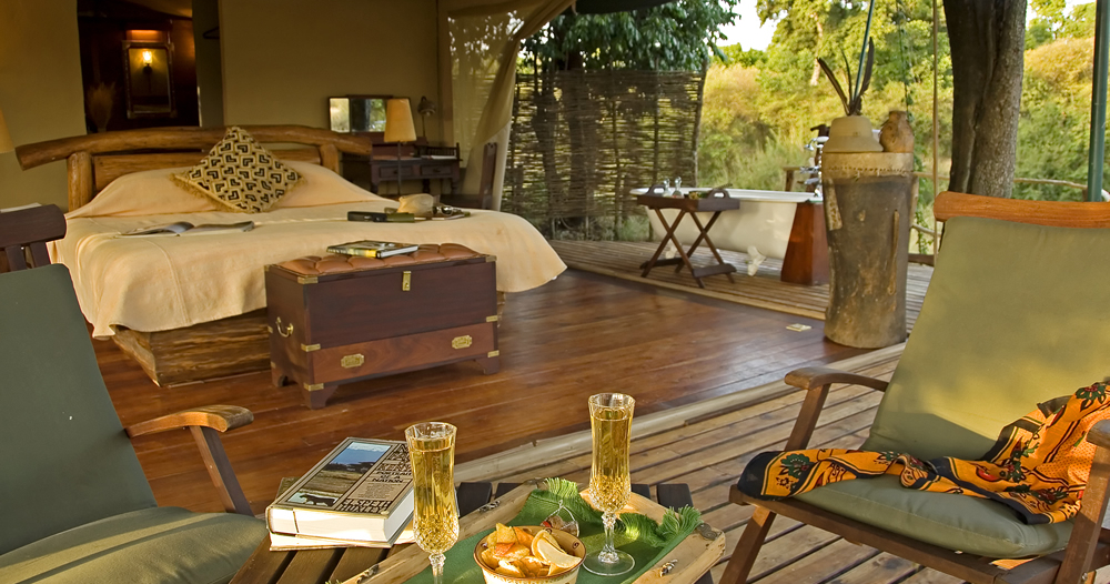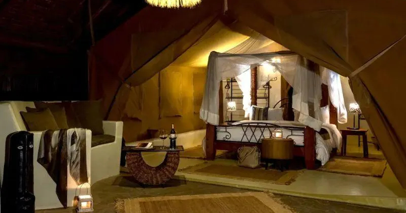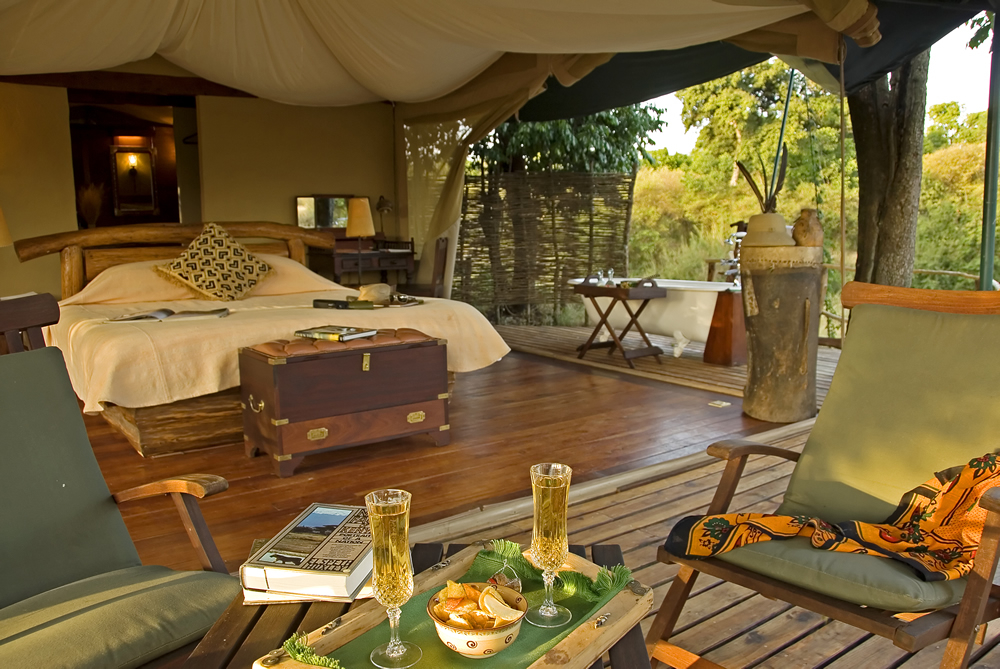 Hvert telt har en eller flere senge, myggenet, privat veranda og eget badeværelse. Uden for teltene er der en brolagt terrasse med udsigt over den smukke vildmark.