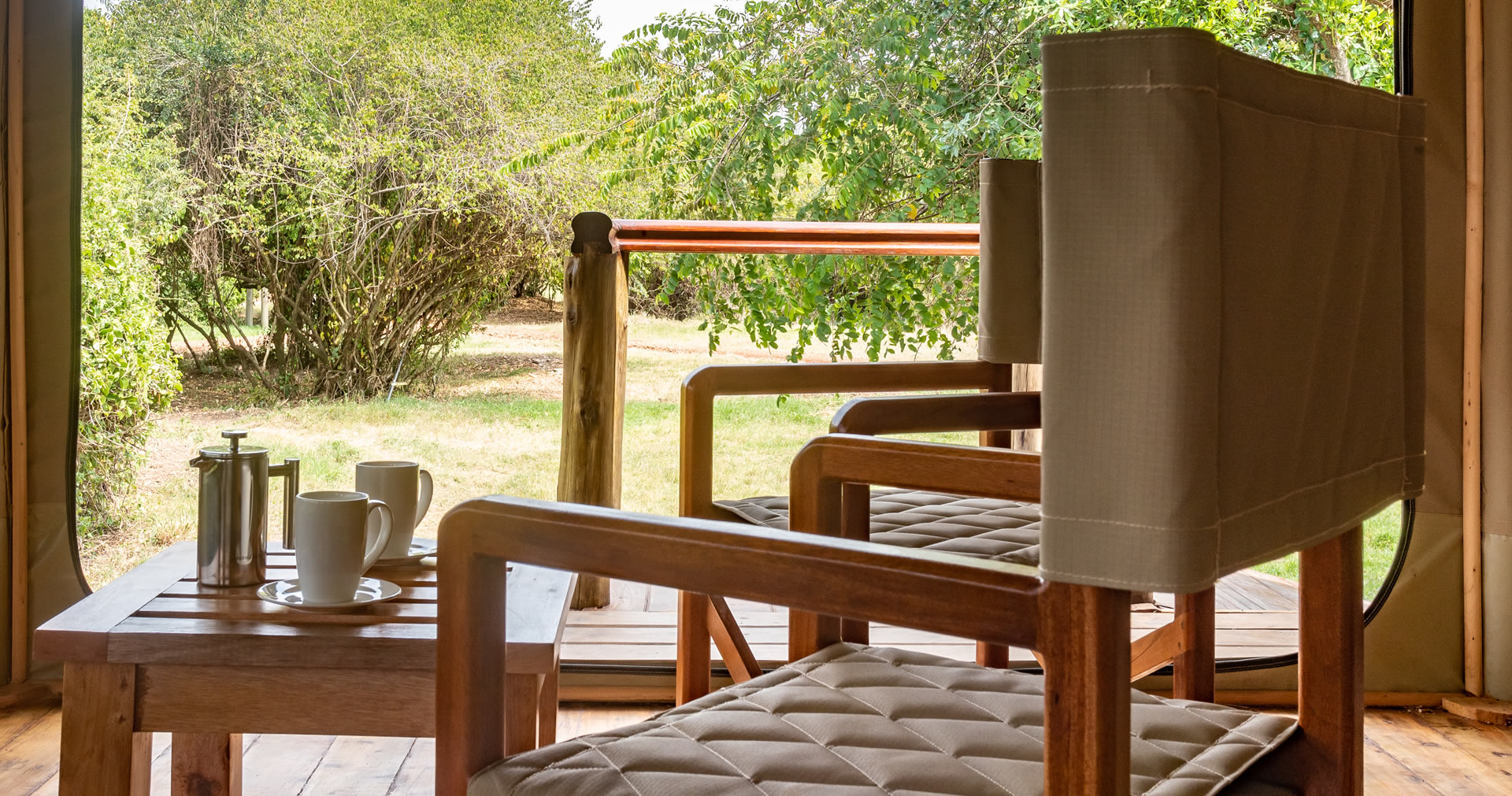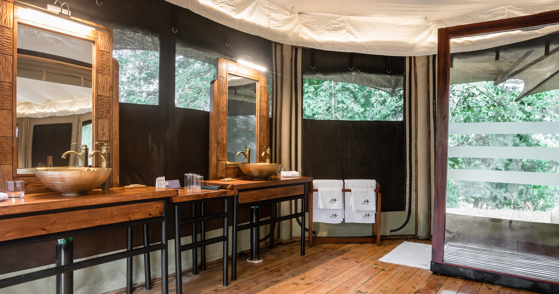 Hvert telt er stilfuldt og komfortabelt indrettet for at sikre en naturnær oplevelse. Den private veranda har en udendørs bruser, så du kan nyde den smukke omgivelse selv mens du bader.