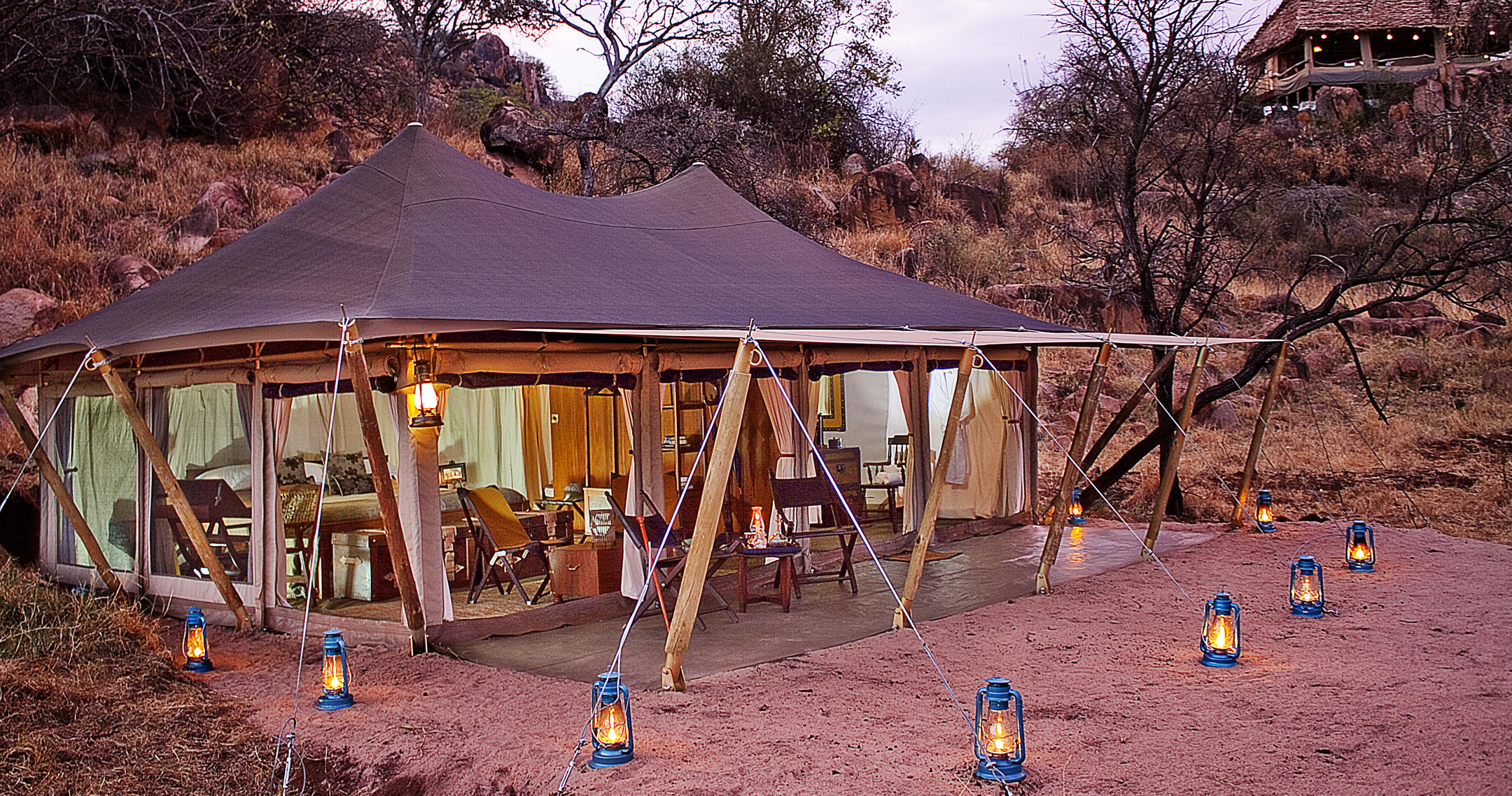 Her findes kun 12 luksuriøse telte, der tilbyder privatliv, komfort og panoramaudsigt. Hvert telt er rummeligt og elegant indrettet med moderne bekvemmeligheder og traditionelt afrikansk design, inklusive eget badeværelse, privat veranda og opholdsområder.