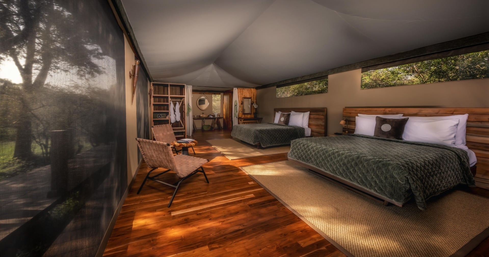 Den autentiske indretning afspejler safarieventyrene fra 1920'erne og suppleres med moderne komfort, inklusive et infinity-pool med udsigt over floden. Med kun 16 telte, inklusive et større familietelt, tilbyder lejren en eksklusiv og privat oplevelse og byder gæster i alle aldre velkommen.
