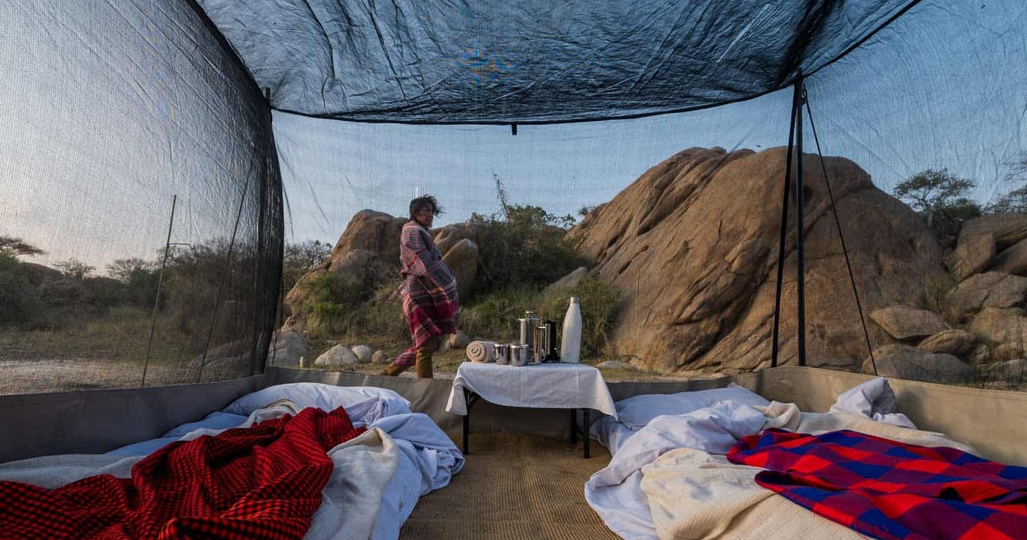 De store, rummelige og elegante telte er bygget på træplatforme. Ud over komfortable senge og badeværelser er der også udendørs bruser. Alle telte har en stor og rummelig veranda, hvor du kan se ud over Serengetis uendelige sletter.
