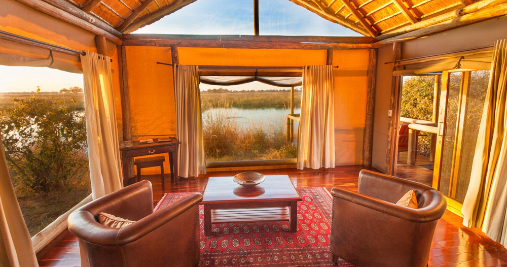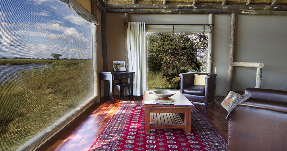 Her findes seksten safaritelte på hævede terrasser, hver med deres egen veranda langs skovkanten ved floden. Hvert telt har en veranda samt et badeværelse med udendørs bruser. Hovedbygningen har bar, pool og en stor terrasse, som giver fantastisk udsigt over Boro-floden og Chiefs Island.
