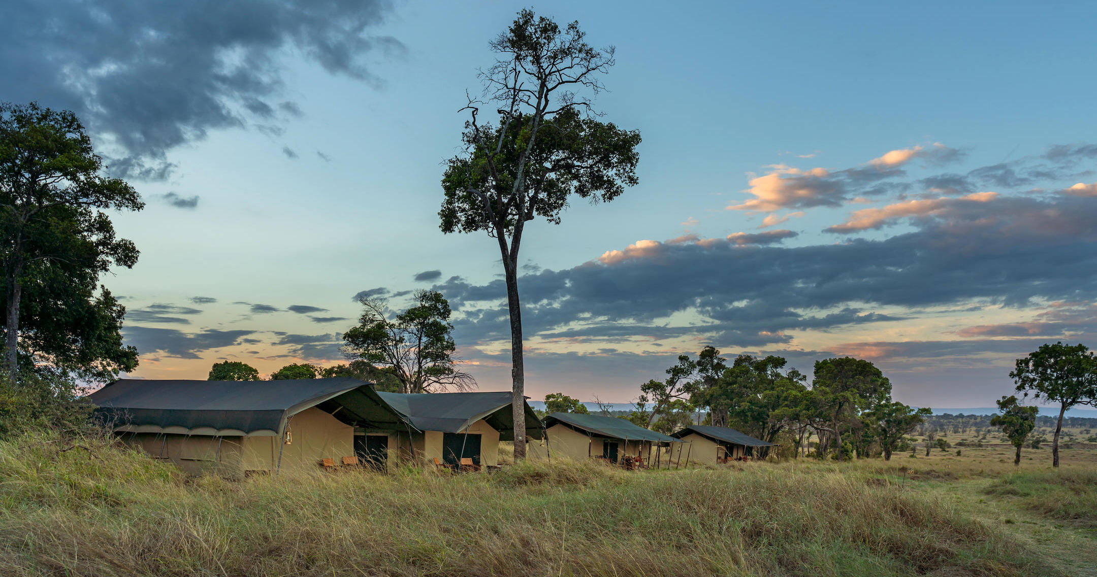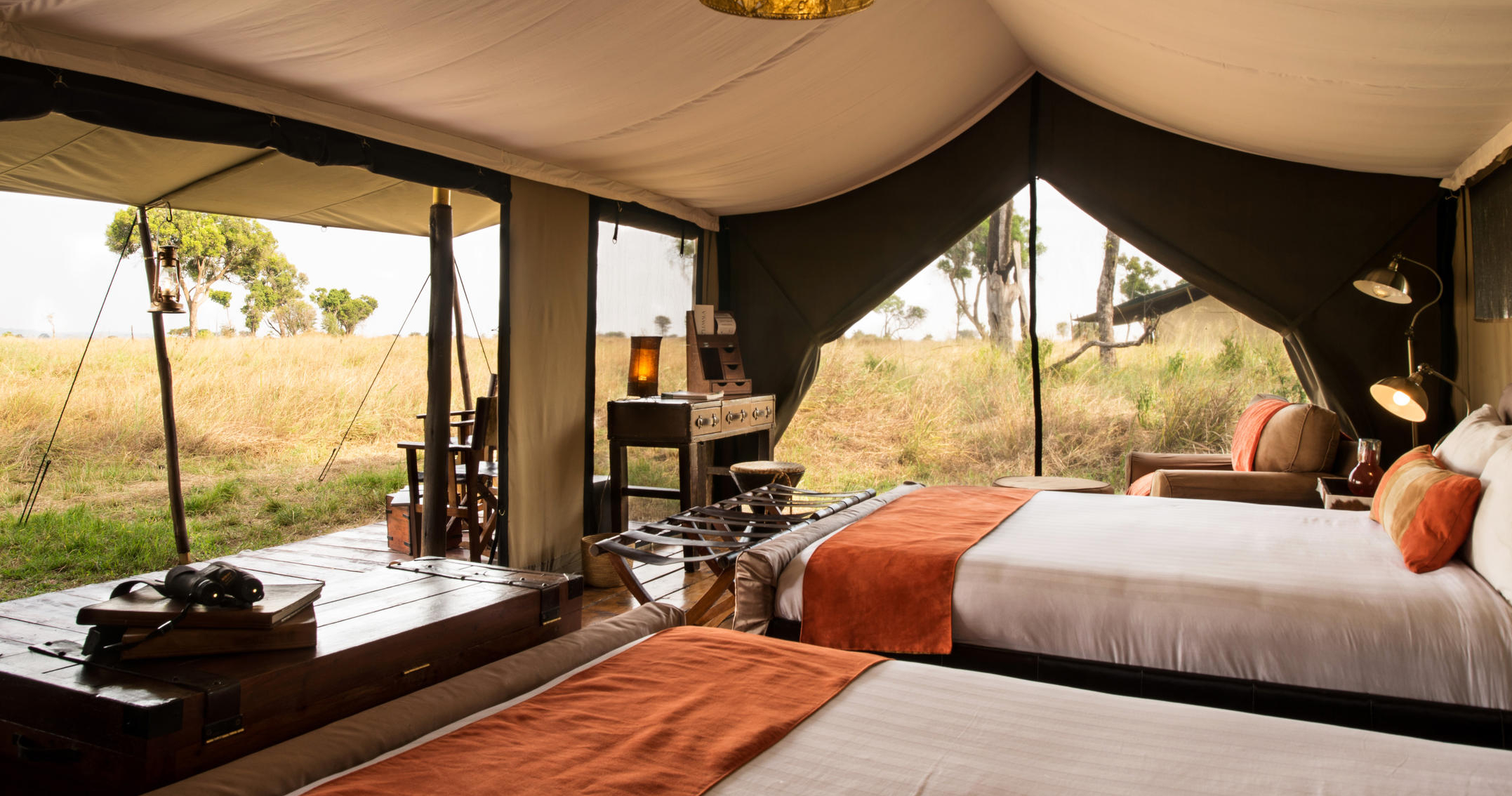 De store, rummelige og elegante telte er bygget på træplatforme. Ud over komfortable senge og badeværelser er der også udendørs bruser. Alle telte har en stor og rummelig veranda, hvor du kan se ud over Serengetis uendelige sletter.