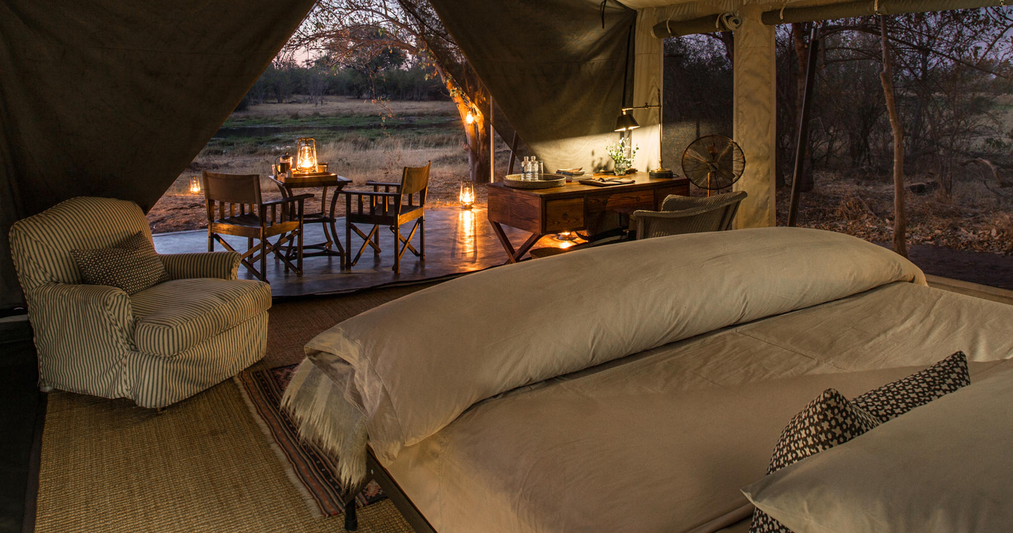 Fly-camps opsættes specielt til hver gruppe og nedtages efterfølgende for at sikre, at der ikke efterlades fodspor på miljøet. En privat kok følger hver campinggruppe for at tilberede friske måltider. Middagen serveres omkring et bål under den uendelige afrikanske stjernehimmel.