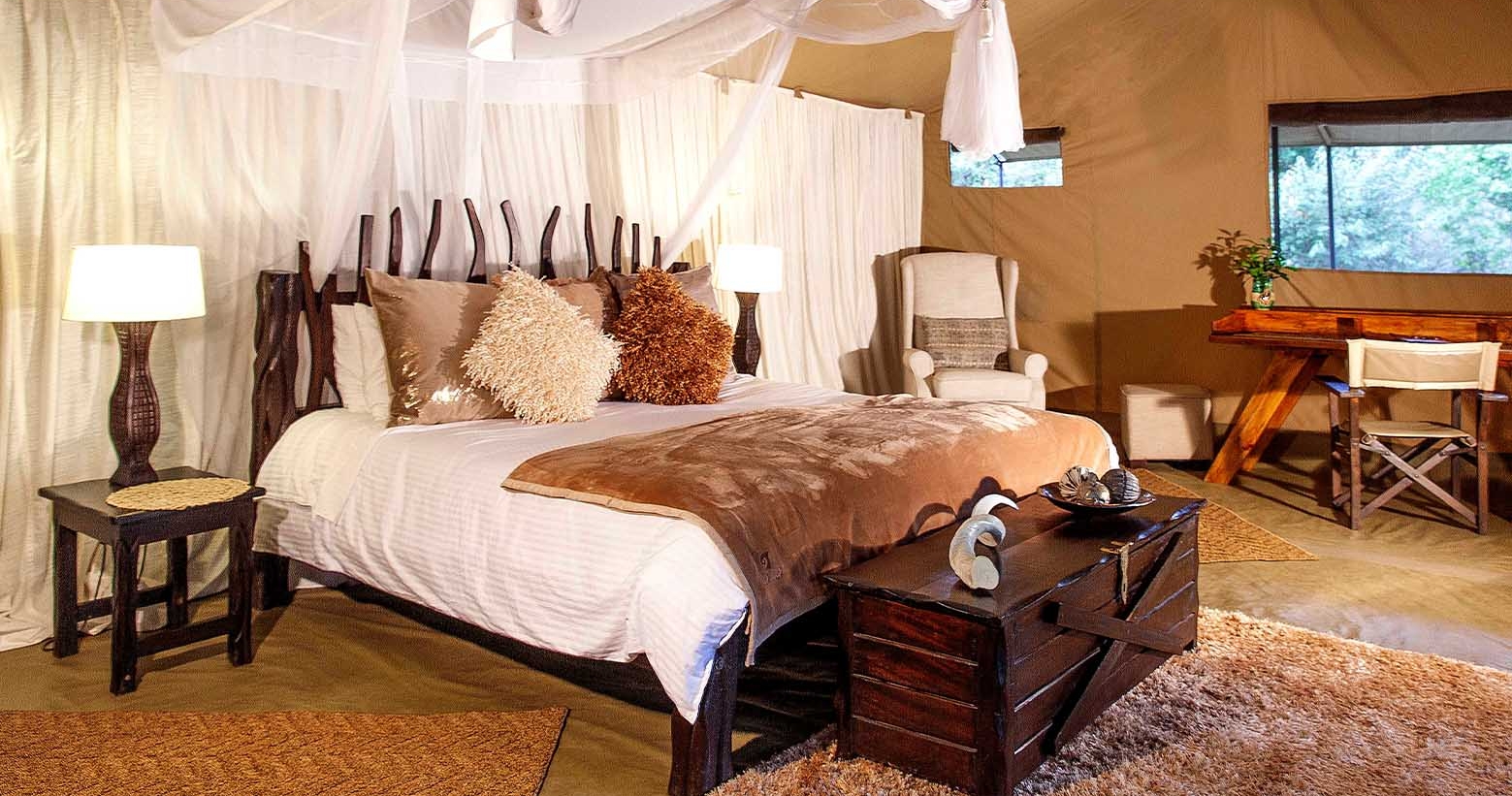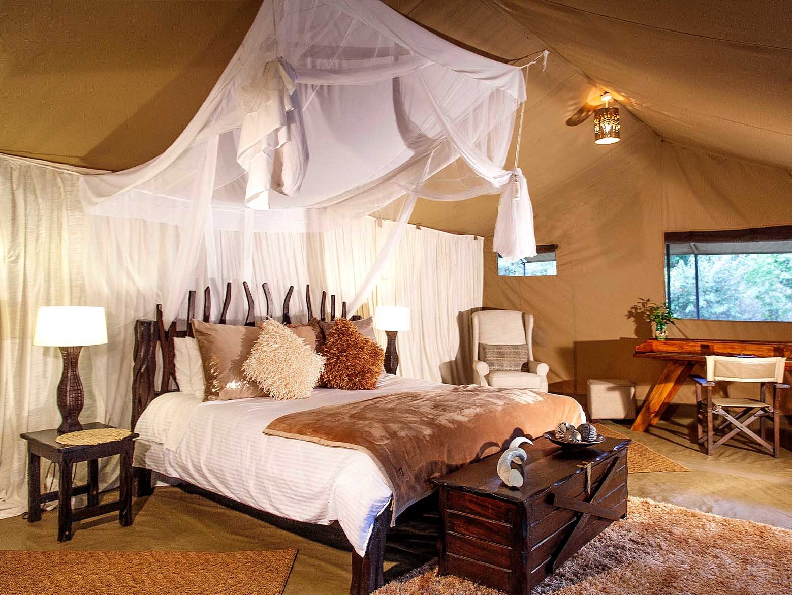 Når du ligger i sengen, kan du trykke på en knap for at åbne taget på teltet. Det eneste, der da skiller dig fra den store afrikanske stjernehimmel, er et usynligt myggenet. Her tilbydes en luksuriøs og naturlig oplevelse af højeste kvalitet.