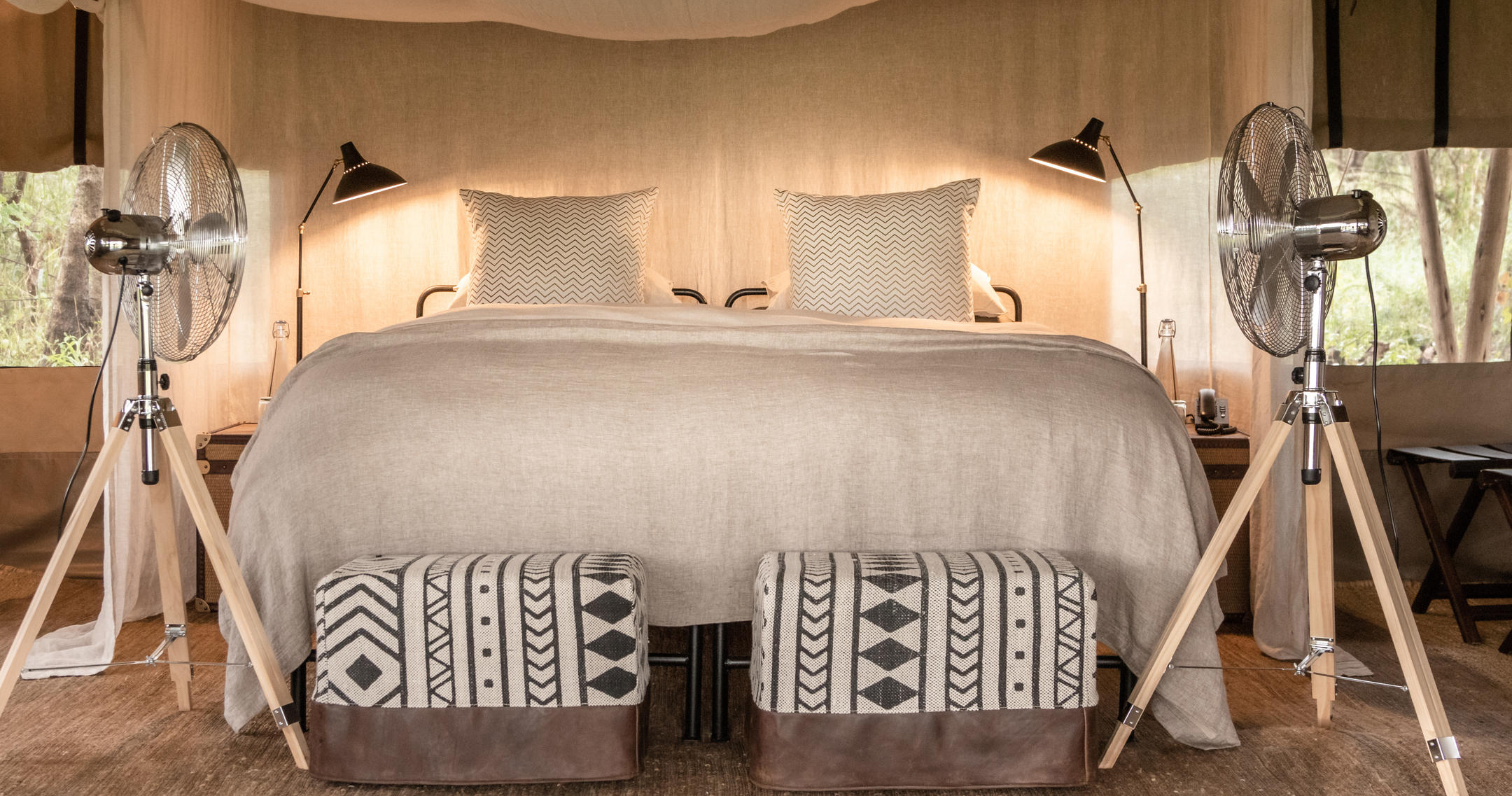 Her findes kun 12 luksuriøse telte, der tilbyder privatliv, komfort og panoramaudsigt. Hvert telt er rummeligt og elegant indrettet med moderne bekvemmeligheder og traditionelt afrikansk design, inklusive eget badeværelse, privat veranda og opholdsområder.