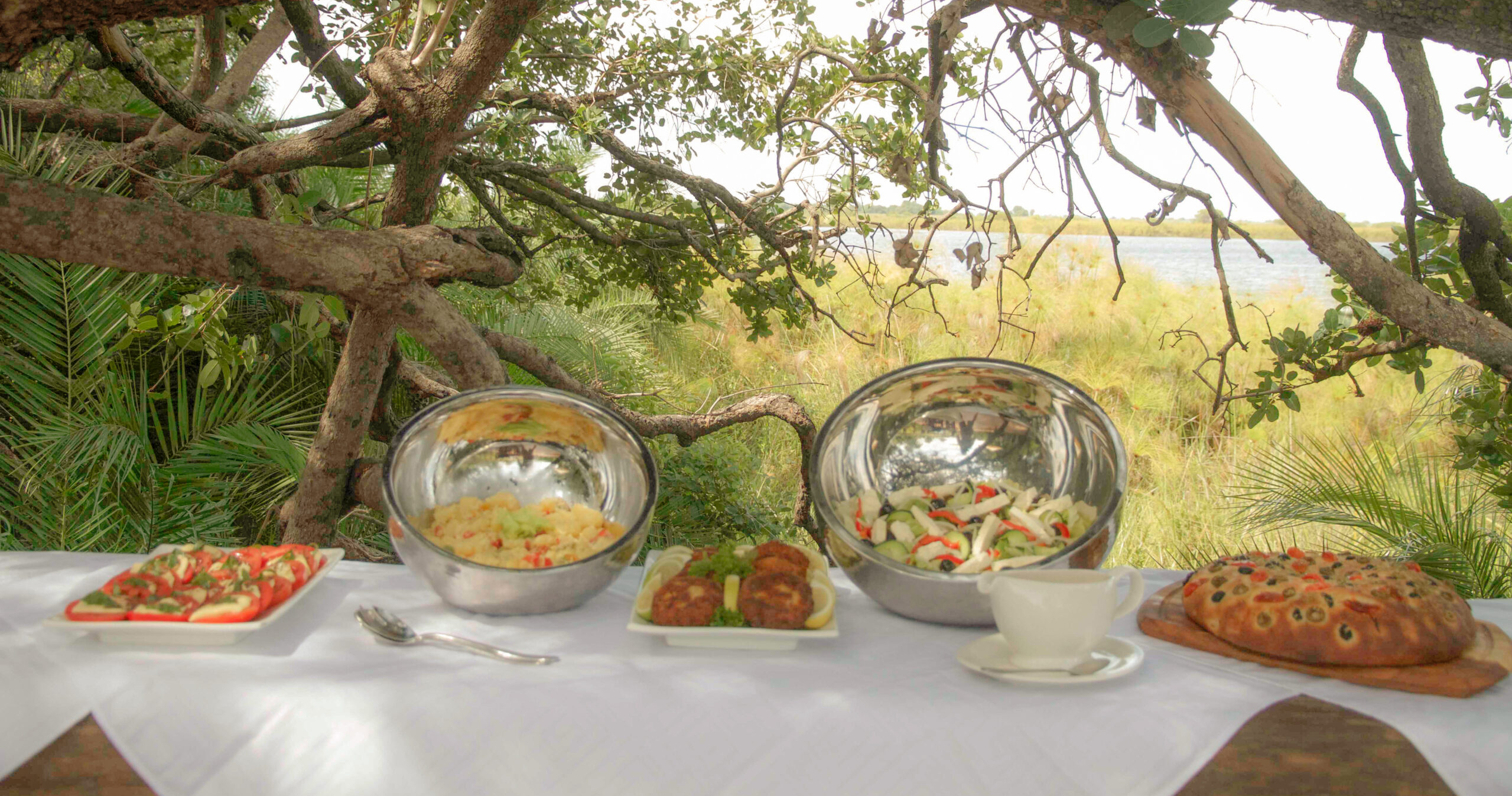 Fly-camps opsættes specielt til hver gruppe og nedtages efterfølgende for at sikre, at der ikke efterlades fodspor på miljøet. En privat kok følger hver campinggruppe for at tilberede friske måltider. Middagen serveres omkring et bål under den uendelige afrikanske stjernehimmel.