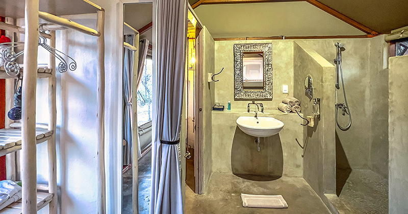 Lejren består af ti rummelige telte med private verandaer, som vender mod floden. Hvert telt har et badeværelse med varme udendørsbrusere og toilet.