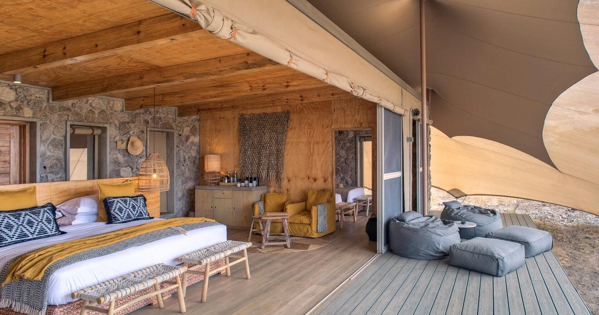 Her findes kun 12 luksuriøse telte, der tilbyder privatliv, komfort og panoramaudsigt. Hvert telt er rummeligt og elegant indrettet med moderne bekvemmeligheder og traditionelt afrikansk design, inklusive eget badeværelse, privat veranda og opholdsområder.