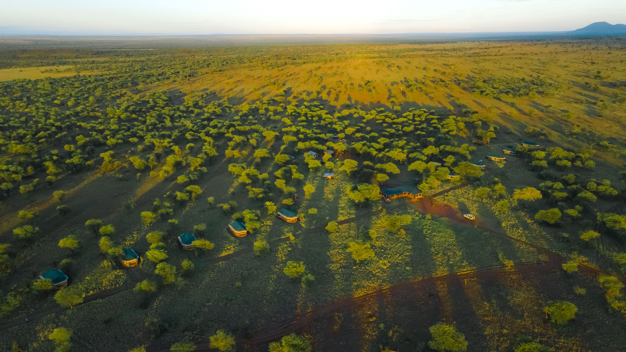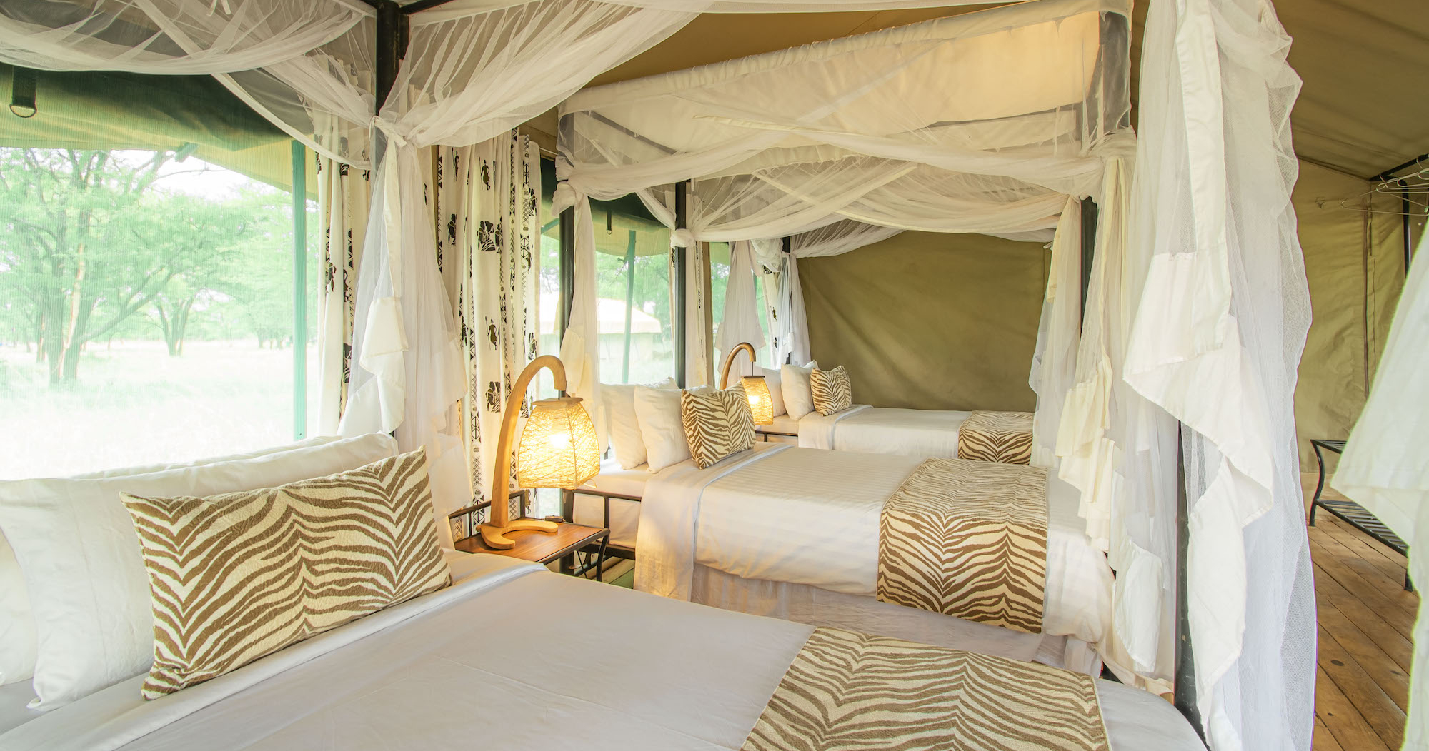 De store, rummelige og elegante telte er bygget på træplatforme. Ud over komfortable senge og badeværelser er der også udendørs bruser. Alle telte har en stor og rummelig veranda, hvor du kan se ud over Serengetis uendelige sletter.