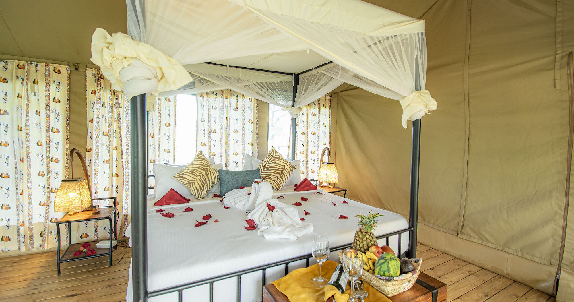 Her findes kun 12 luksuriøse telte, der tilbyder privatliv, komfort og panoramaudsigt. Hvert telt er rummeligt og elegant indrettet med moderne bekvemmeligheder og traditionelt afrikansk design, inklusive eget badeværelse, privat veranda og opholdsområder.