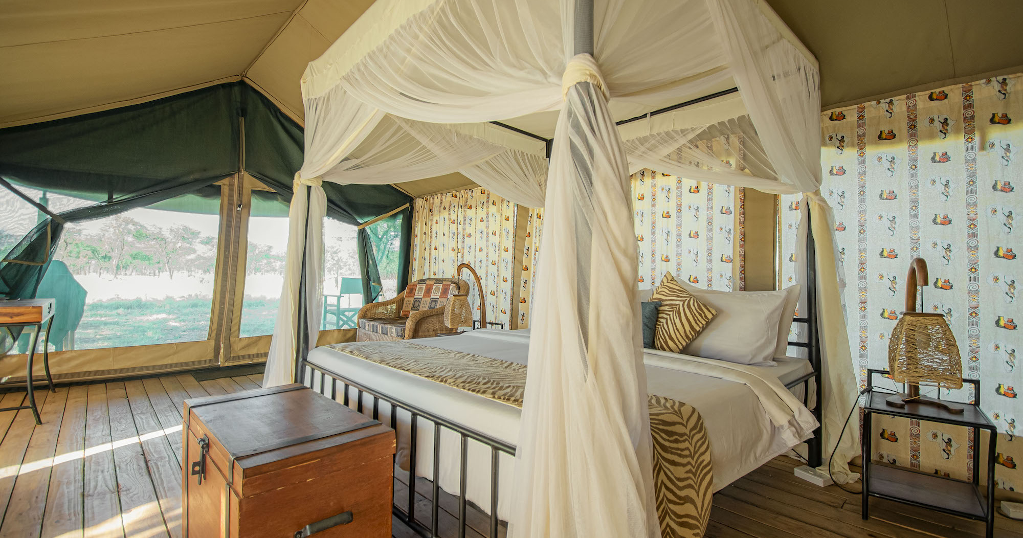 Campen består af smagfuldt indrettede telte, som skaber en herlig safariatmosfære. De rummelige telte har komfortable senge, toilet, brusebad og en stor veranda med udsigt over savannen.