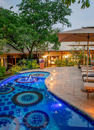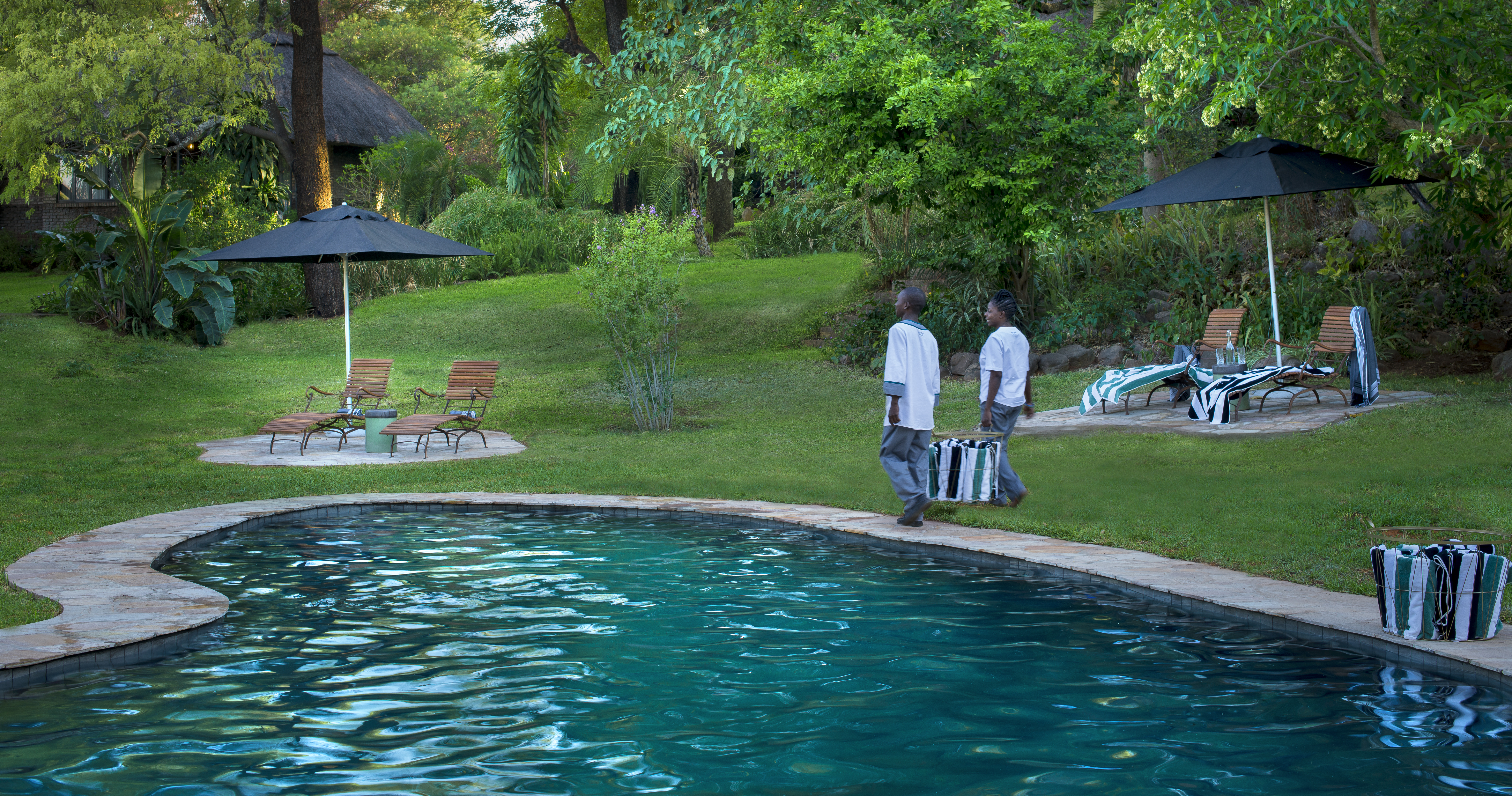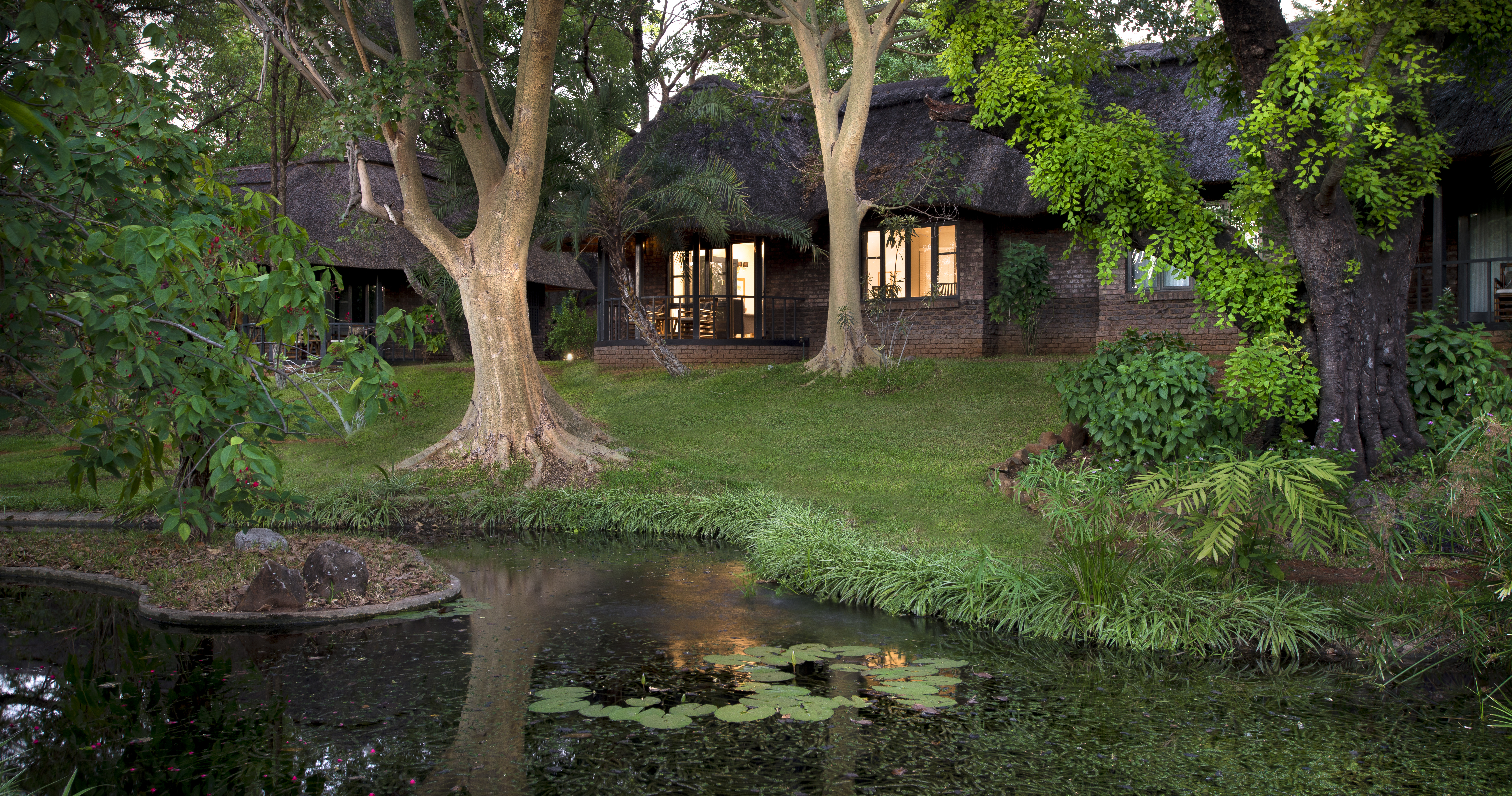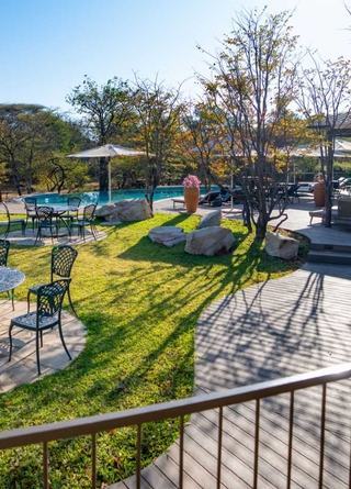 Lodgen ligger kun 2 kilometer fra Victoriafald, hvilket gør den til et ideelt udgangspunkt for at udforske området. Værelserne er omgivet af frodige haver og majestætiske teaktræer, med lodgens infinity-pool som et centralt samlingspunkt.