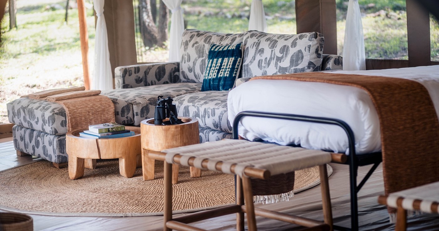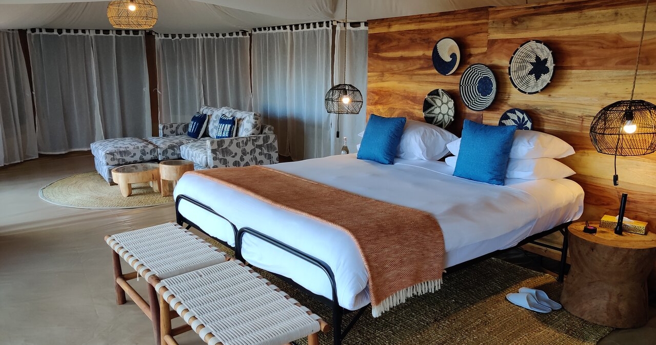 Her findes kun 12 luksuriøse telte, der tilbyder privatliv, komfort og panoramaudsigt. Hvert telt er rummeligt og elegant indrettet med moderne bekvemmeligheder og traditionelt afrikansk design, inklusive eget badeværelse, privat veranda og opholdsområder.