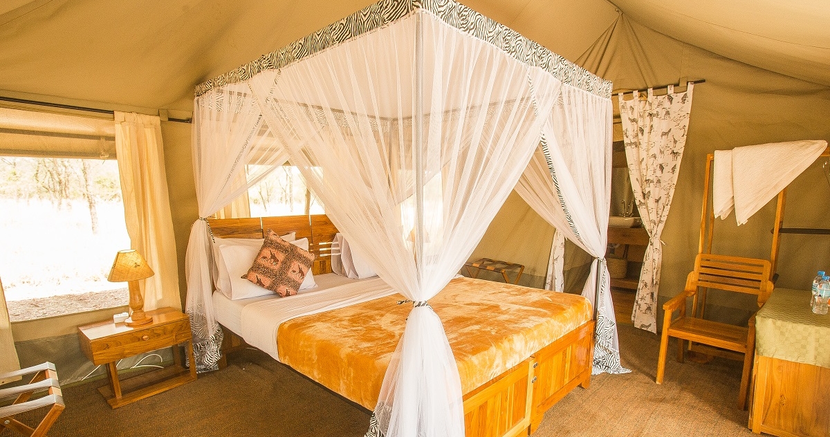 De store, rummelige og elegante telte er bygget på træplatforme. Ud over komfortable senge og badeværelser er der også udendørs bruser. Alle telte har en stor og rummelig veranda, hvor du kan se ud over Serengetis uendelige sletter.